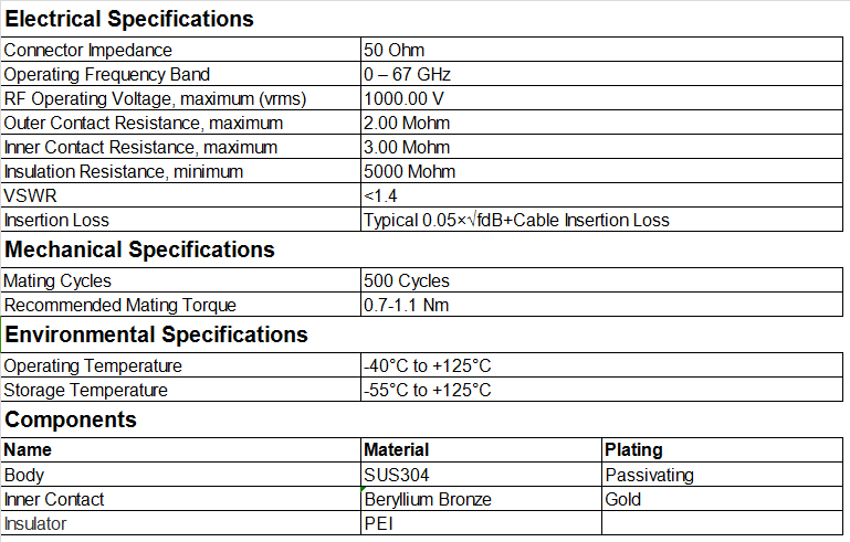 1.85mm Male to 1.85mm Male RF Coaxial Test Cable Assembly to 60GHz