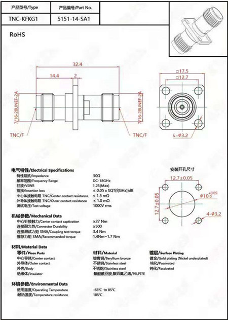 TNC-Kfk, TNC Female to TNC Female 4 Hole Flange RF Coaxial Connector