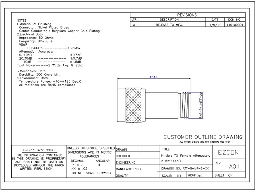 N Male to Female Attenuator, 6GHz, 1watt, 3dB