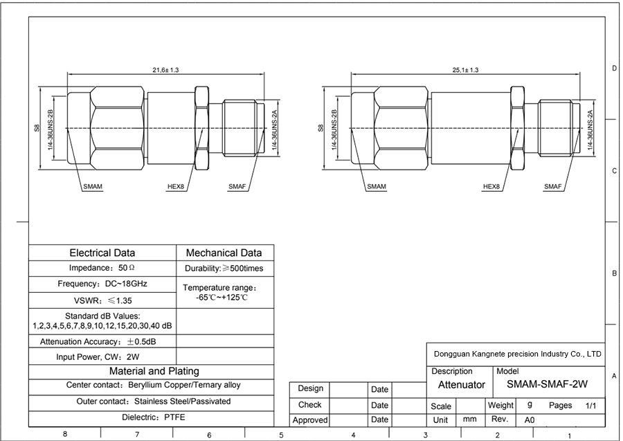 10 dB Fixed Attenuator, SMA Male to SMA Female Rated to 2 Watts up to 18 GHz